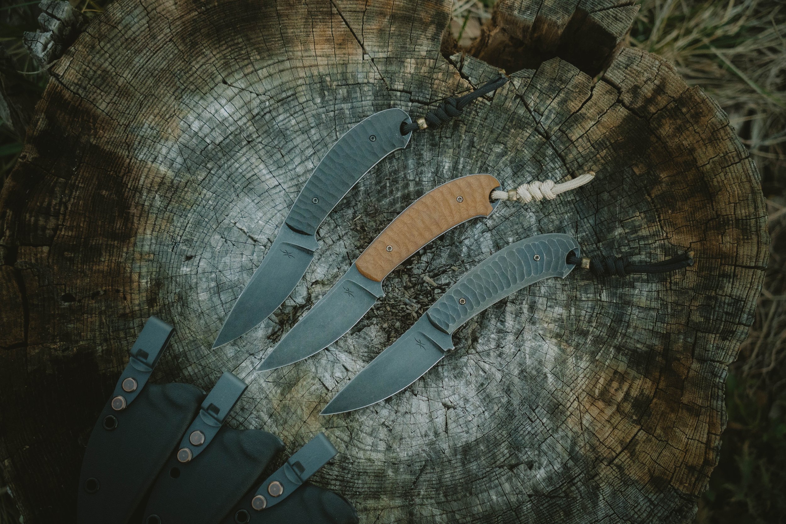 The Pack Hunter is my classic drop point style outdoorsman blade. It is perfect for hunting, fishing, camping, or even EDC for those who like to carry a fixed blade every day. It is made from a high carbon steel which has been an industry standard tried and tested blade steel for years. It has a dark stonewash finish and low profile textured handle scales. There is a Black G10, Natural Micarta, and Anodized and Stonewashed Grade 5 Titanium. They come with a kydex sheath that has a Discrete Carry Concept Clip that allows for pocket carry very comfortably or putting it in a backpack pouch securely.