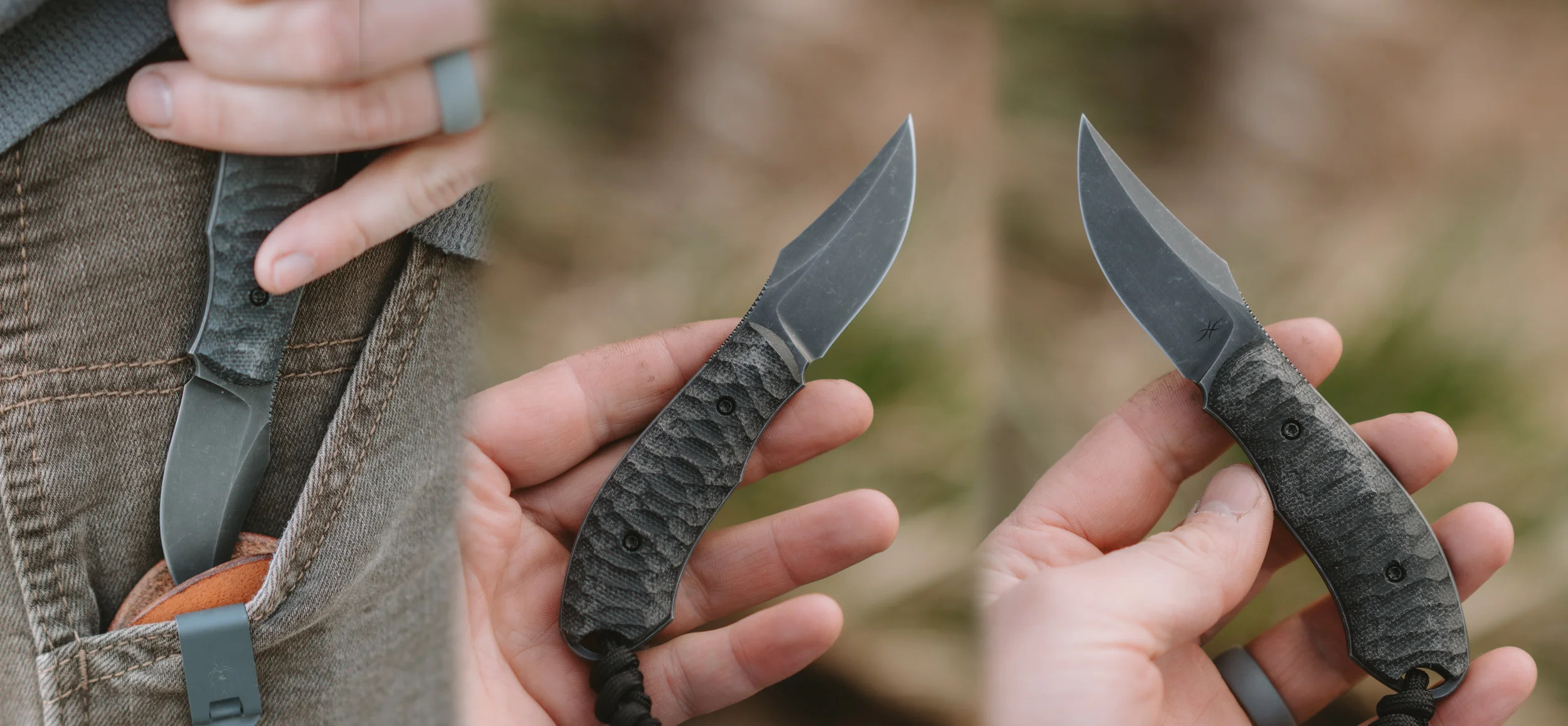 The Outpost Mini is like the EDC but slightly smaller and really purpose built to fit in your pocket easily and go with you through your day without being bulky or heavy. It is made from 3/16” bar stock and has 1/8” scales that are slightly inset from the perimeter of the handle to keep it as low profile as possible. The scales are textured for grip and it has jimping on the thumb rest to provide grip even when wet. The sheath that comes with it is a leather pocket sheath with a Discrete Carry Concept Clip to retain the sheath when drawing the knife from the pocket.